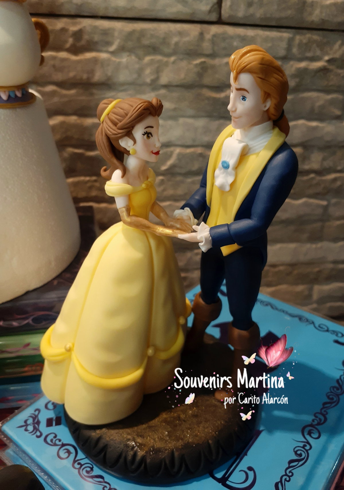 Adorno para torta Bella y Principe Adam con base. Bella mide 15cm de alto y Principe 17cm. Realizado en porcelana fría.