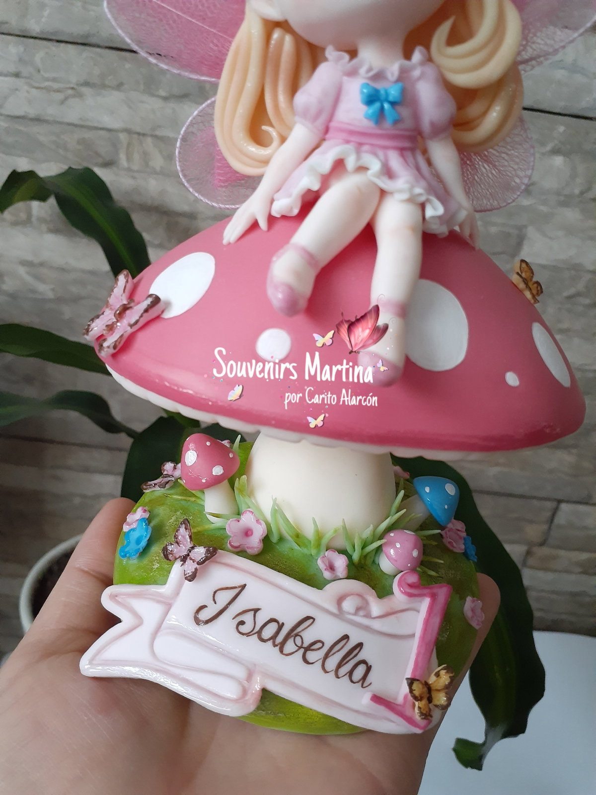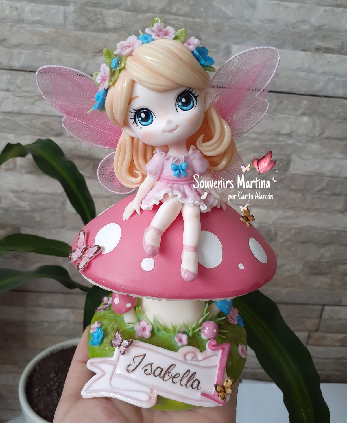Figura con base Hada sentada en honguito. Realizado en porcelana fría. Mide 20cm de alto apróx.