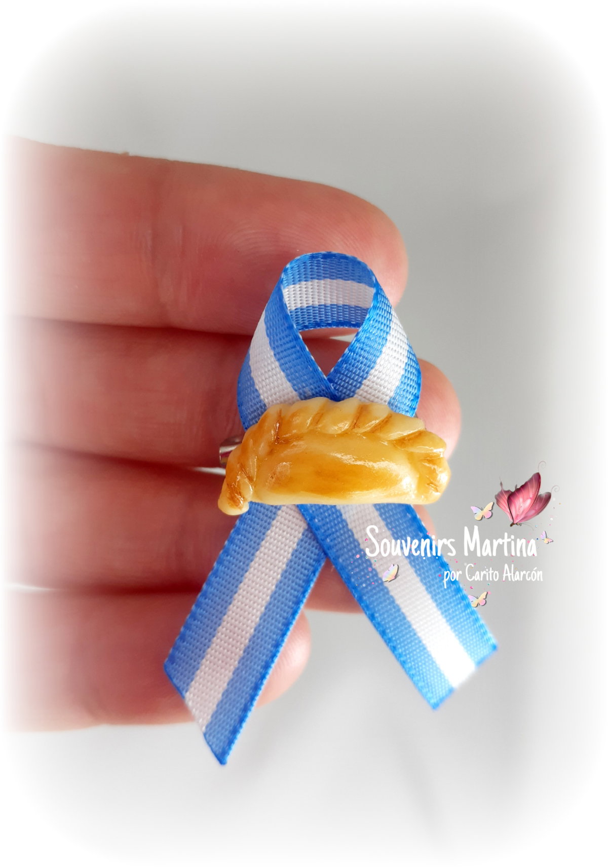 Escarapela con dije de Empanada realizada en porcelana fría.