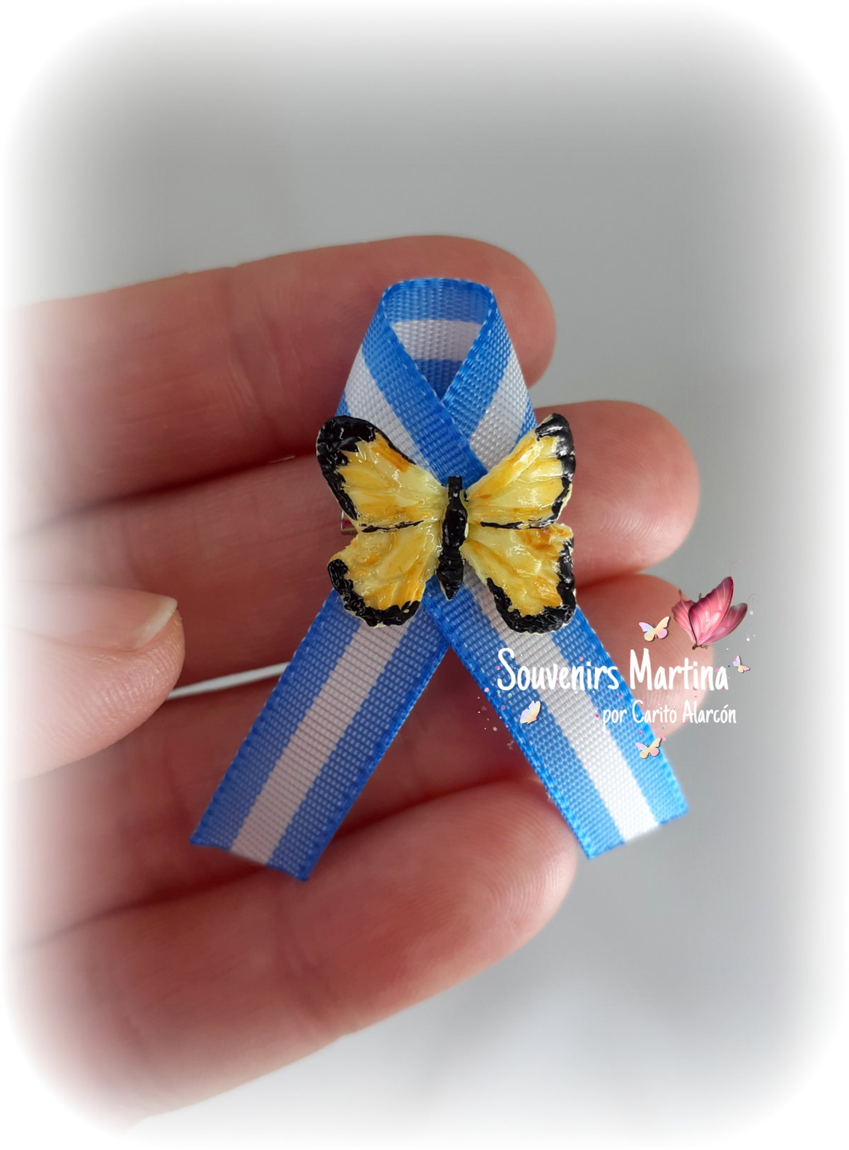 Escarapela con dije de Mariposa, realizado en porcelana fría.