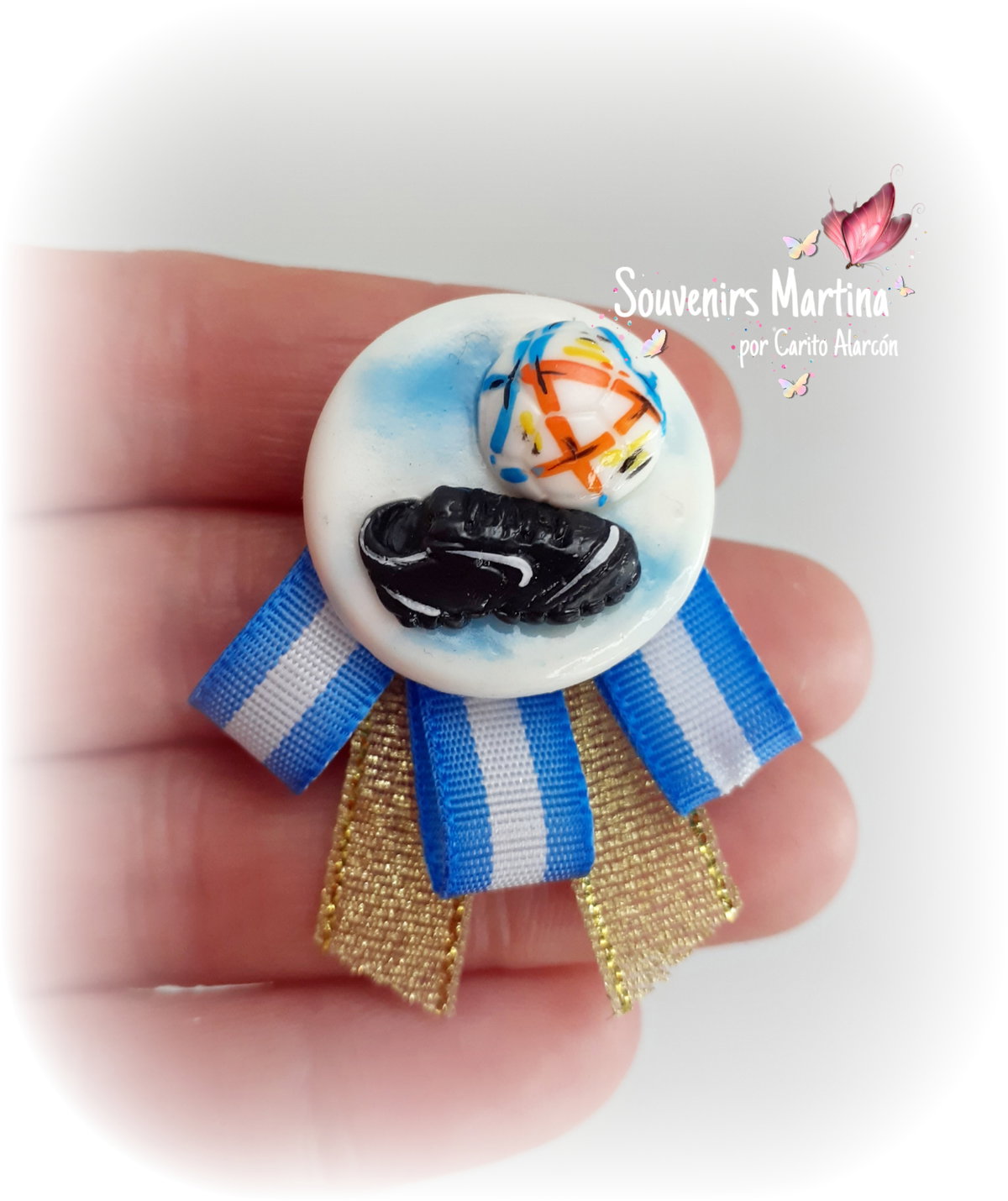 Escarapela con dije de Botin de futbol, realizado en porcelana fría y con cinta dorada.