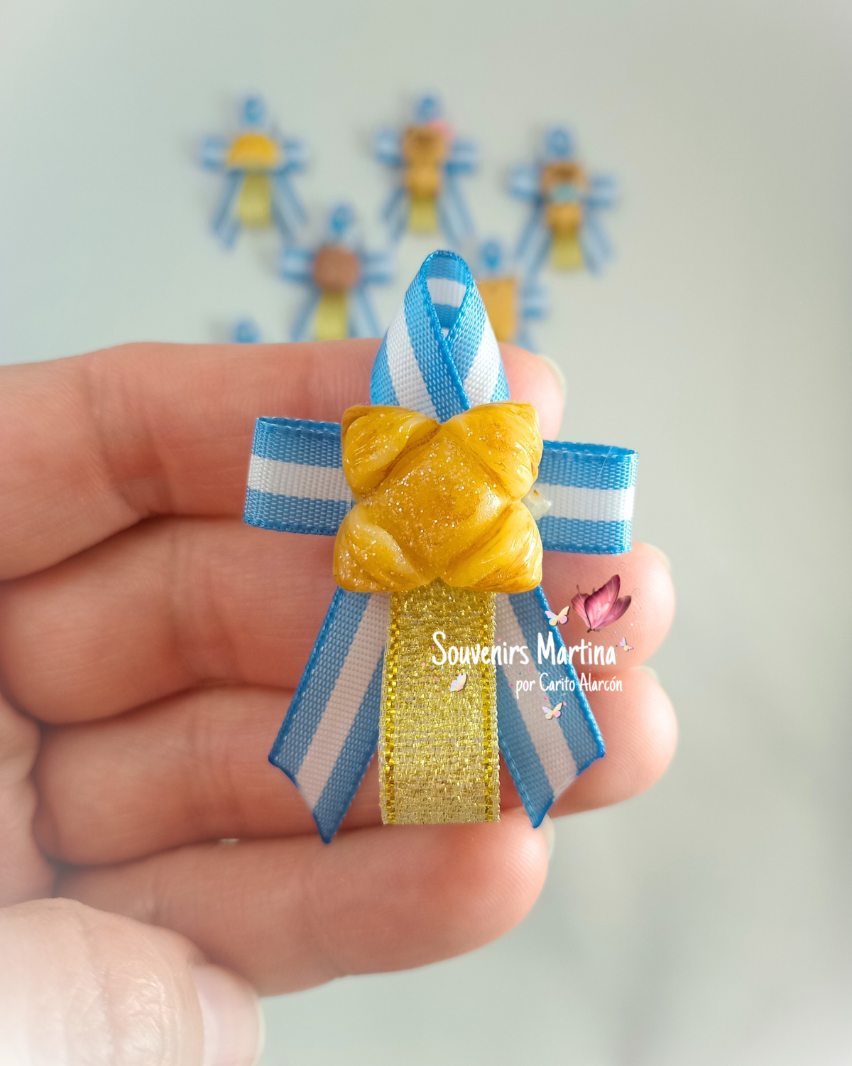Escarapela con dije de Pastelito, realizado en porcelana fría y con cinta dorada.