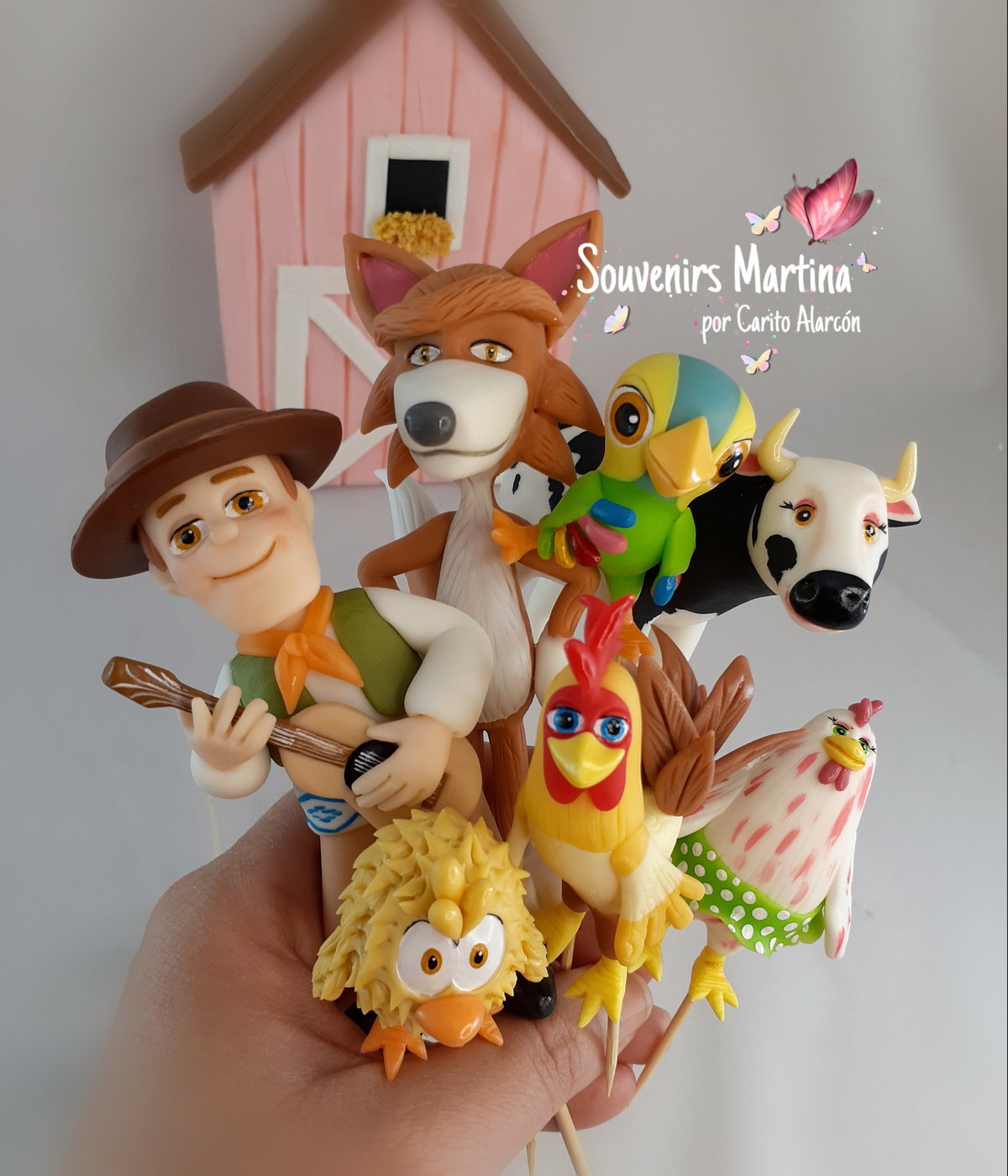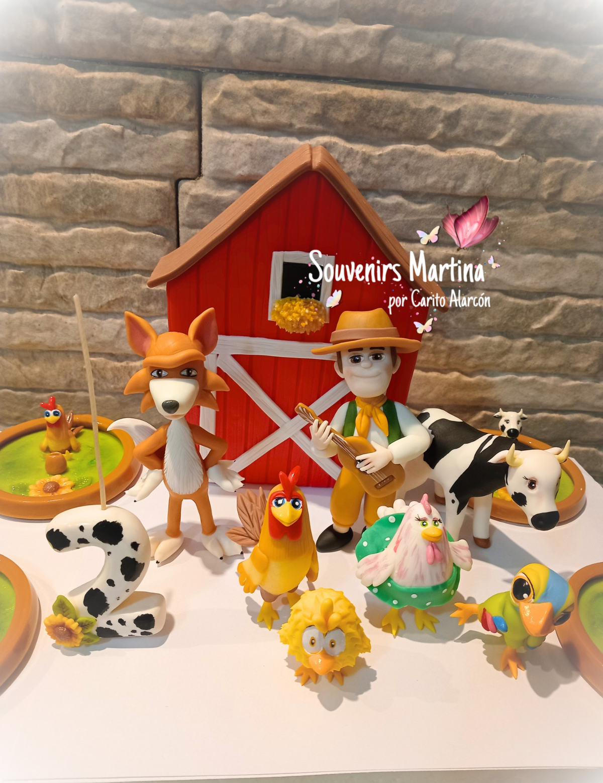 Adorno para pinchar directamente en la torta. Incluye: Granero de 12cm x 18cm, Velita número, Zenon, Lobo, Bartolito, Loro Pepe, Gallina, vaca Lola y pollito.