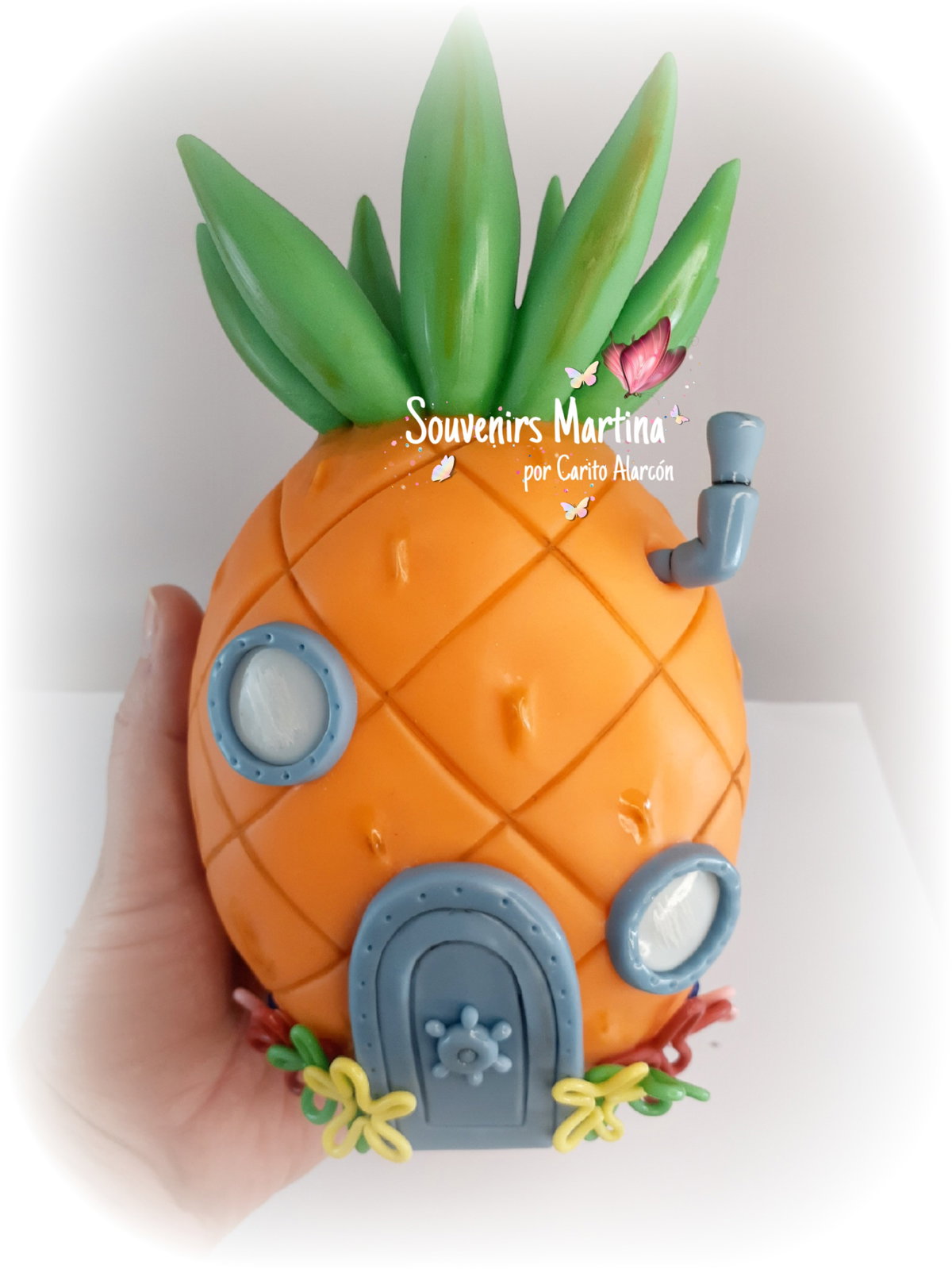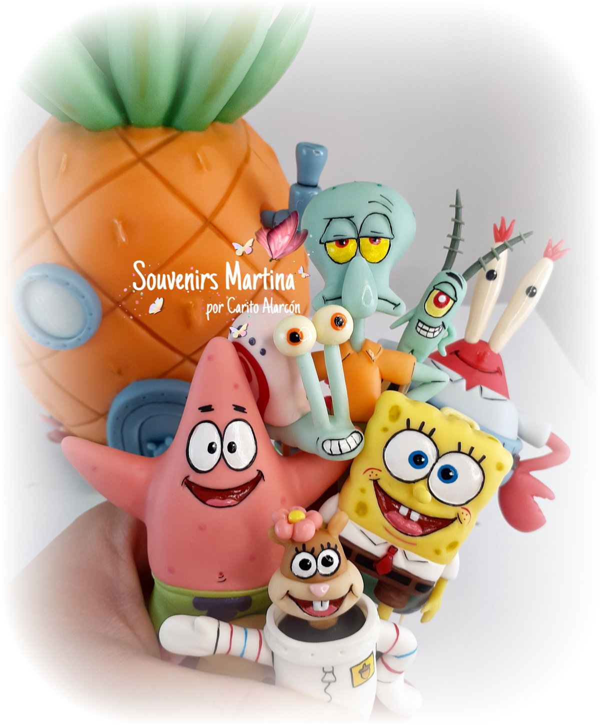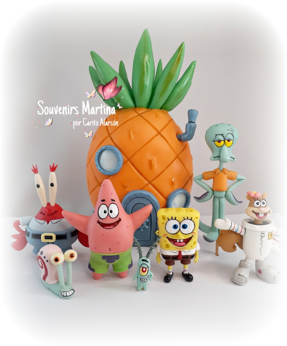 Adorno para pinchar directamente en la torta. Incluye: Piña de 22cm x 11,5 cm , Bob Esponja , Patricio, Arenita, Calamardo, Planton, Don Cangrejo y Gary.