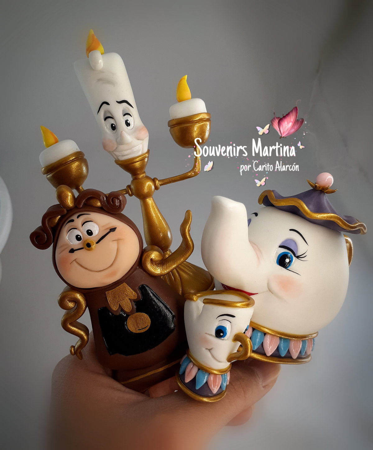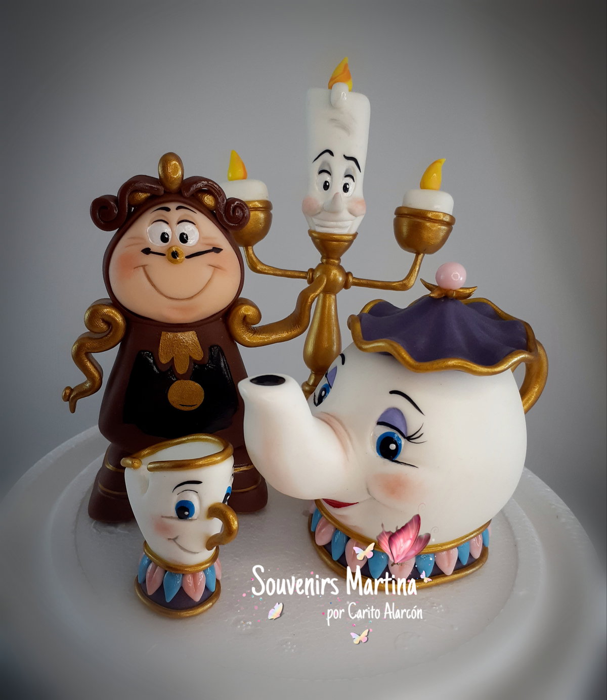 Adorno Personajes de Bella y Bestia para pinchar directamente en la torta. Incluye: Lumiere de 12cm, Ding dong de 10cm, Tetera de 8cm y Tacita de 4cm. Realizados en porcelana fría.