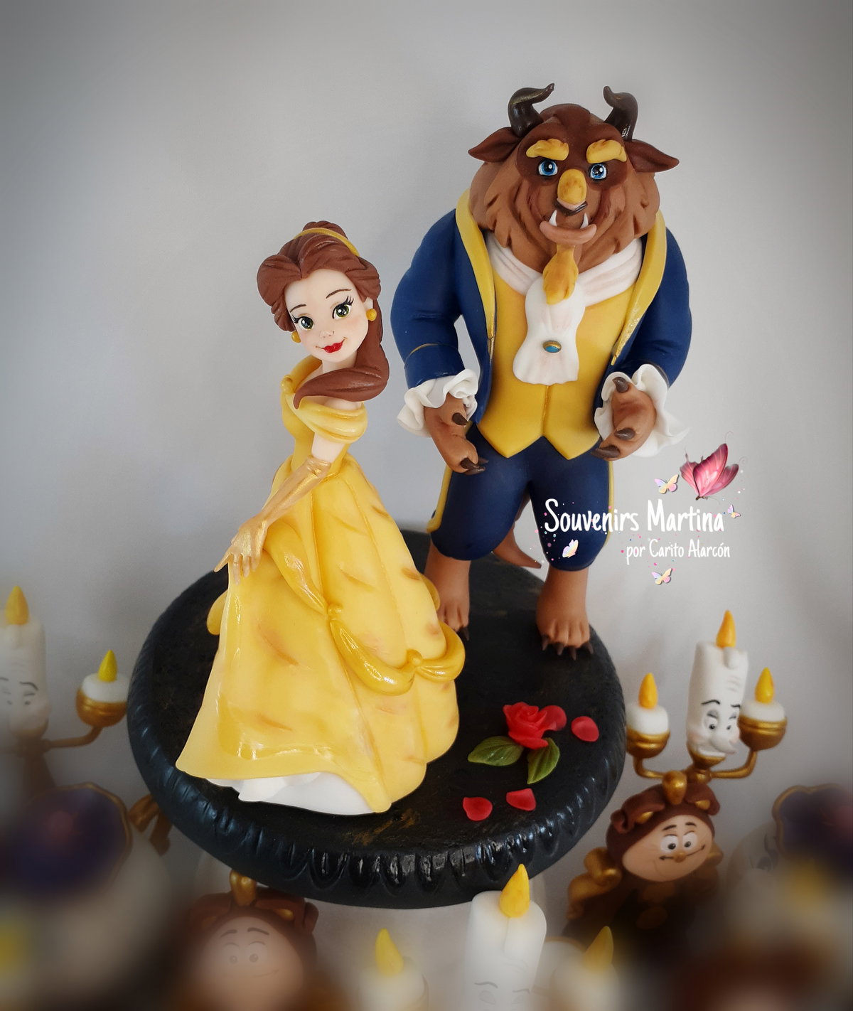 Adorno para torta La Bella y la Bestia con base. Bella mide 15cm de alto y Bestia 18cm. Realizado en porcelana fría.